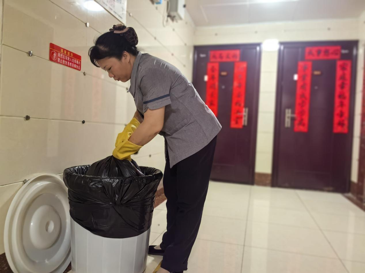 和以往任何一天一樣,迎著朝陽,市區(qū)工程服務(wù)處的保潔大姐黃仕娟早早地開始了一天的工作。黃姐的主要工作是對整棟宿舍樓每個(gè)樓層的垃圾進(jìn)行收集,再裝運(yùn)到小區(qū)物業(yè)的垃圾集中點(diǎn)以及清潔宿舍樓內(nèi)的活動(dòng)室、兒童樂園。雖然工作簡單重復(fù),但她總能以飽滿的熱情,全身心投入工作,確保宿舍每個(gè)樓層垃圾不溢出,不堆積,無異味,保證每層樓道的衛(wèi)生清潔,保持節(jié)日期間宿舍樓的干凈整潔。